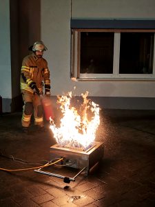 Bei einer praktischen Übung konnte der Umgang mit dem Feuerlöscher im Außenbereich am „Fire-Trainer“ beübt werden.